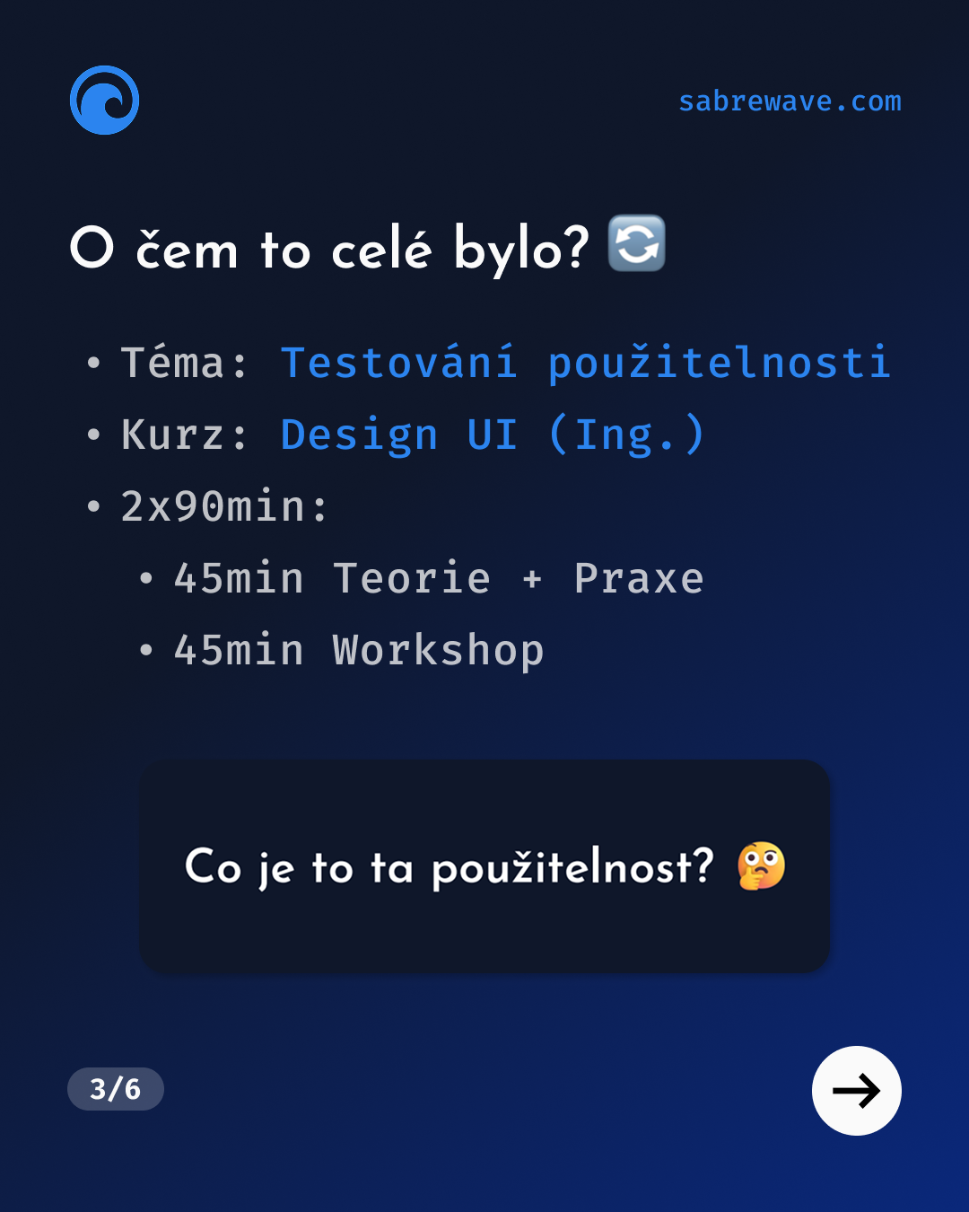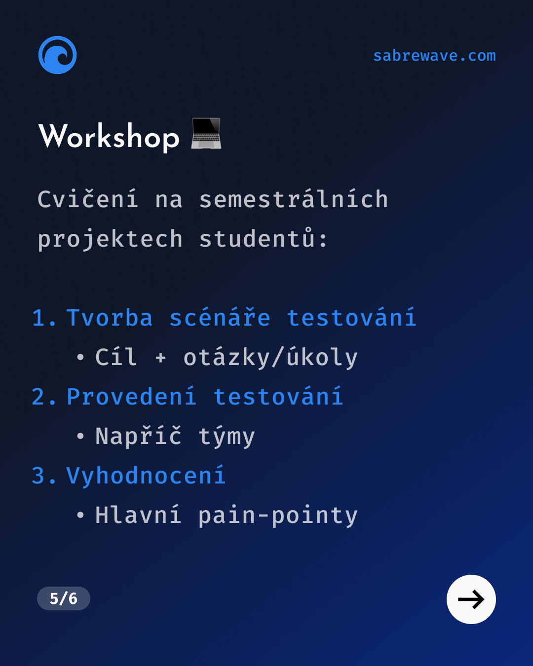 Václav Šimůnek, jednatel společnosti Sabrewave, přednášel studentům VŠE v Praze o uživatelském testování v rámci předmětu Design UI. Ve dvou přednáškách spojil úvodní teorii s workshopem nad prototypy ve Figmě a sdílel osvědčené metody i tipy z praxe.