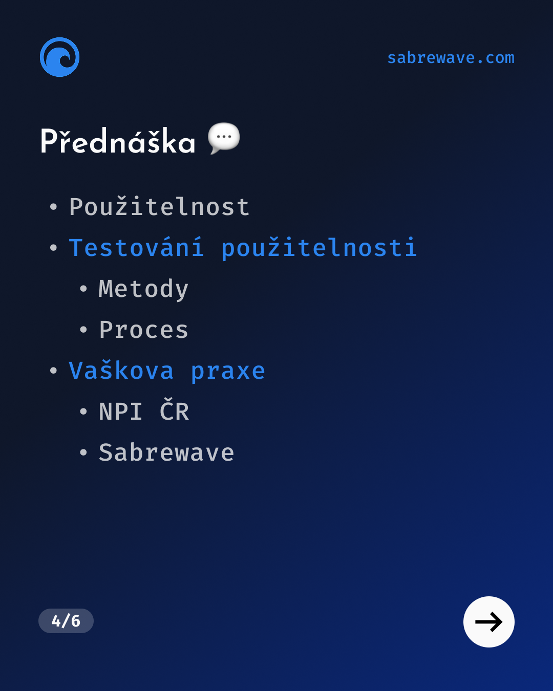 No a na konec přednášky to nejlepší – moje praxe v rámci uživatelských testování, kterou jsem nabral ať už v naší firmě Sabrewave, nebo v Národním pedagogickém institutu České republiky. Třešničkou na dortu byly 4 tipy, které jsem záměrně vybral jako něco, co by studentům mohlo pomoci posunout jejich (nejen) testování na vyšší úroveň.
